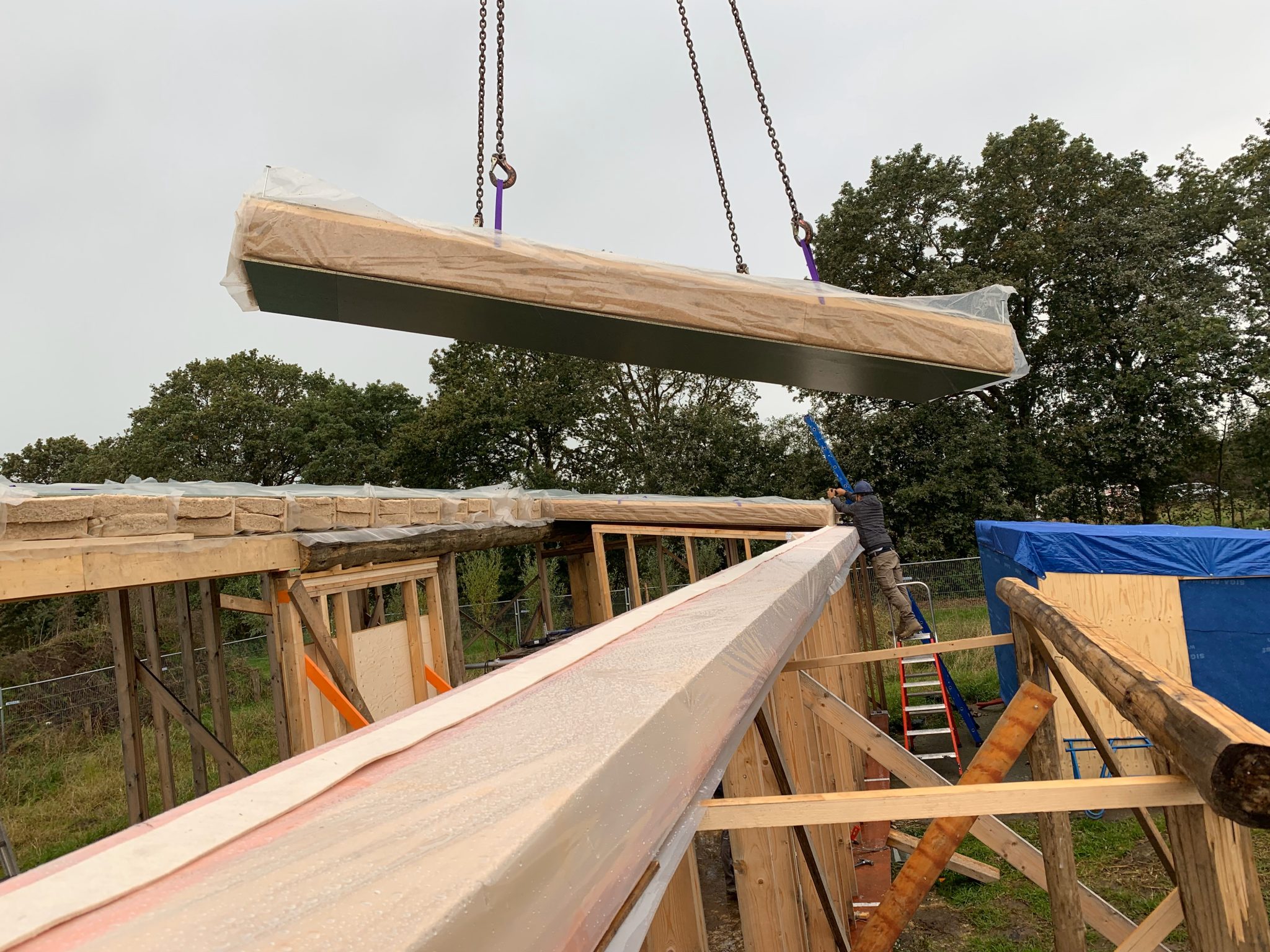 Centrale dakligger in Cloeziana. Dit is een snel groeiende boom en dus veel co2 opslag en toch sterkte klasse D 50. Gewicht van deze stam ongeveer 500 kg. Werken met rondhout is altijd een leuke uitdaging voor de vakmannen.