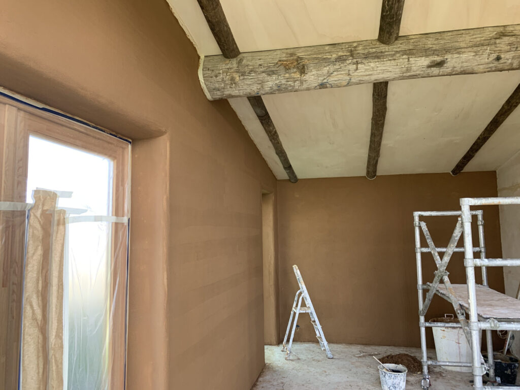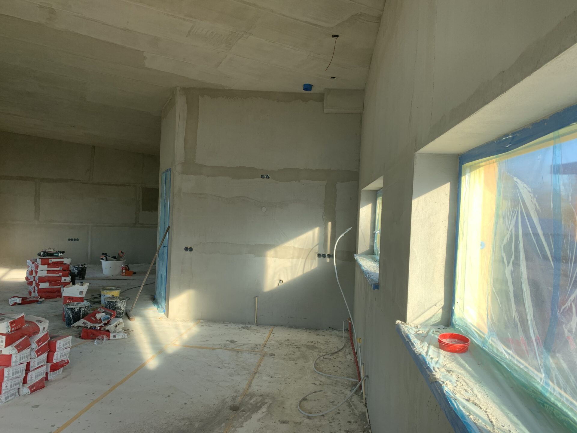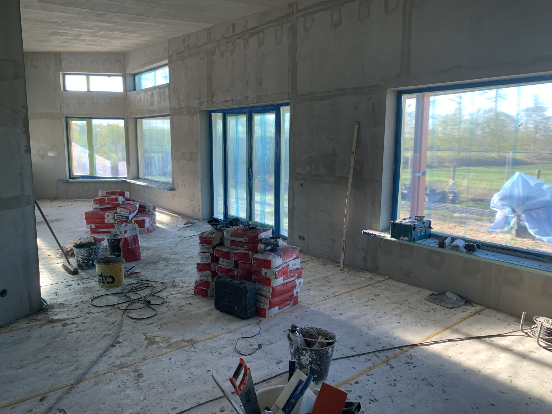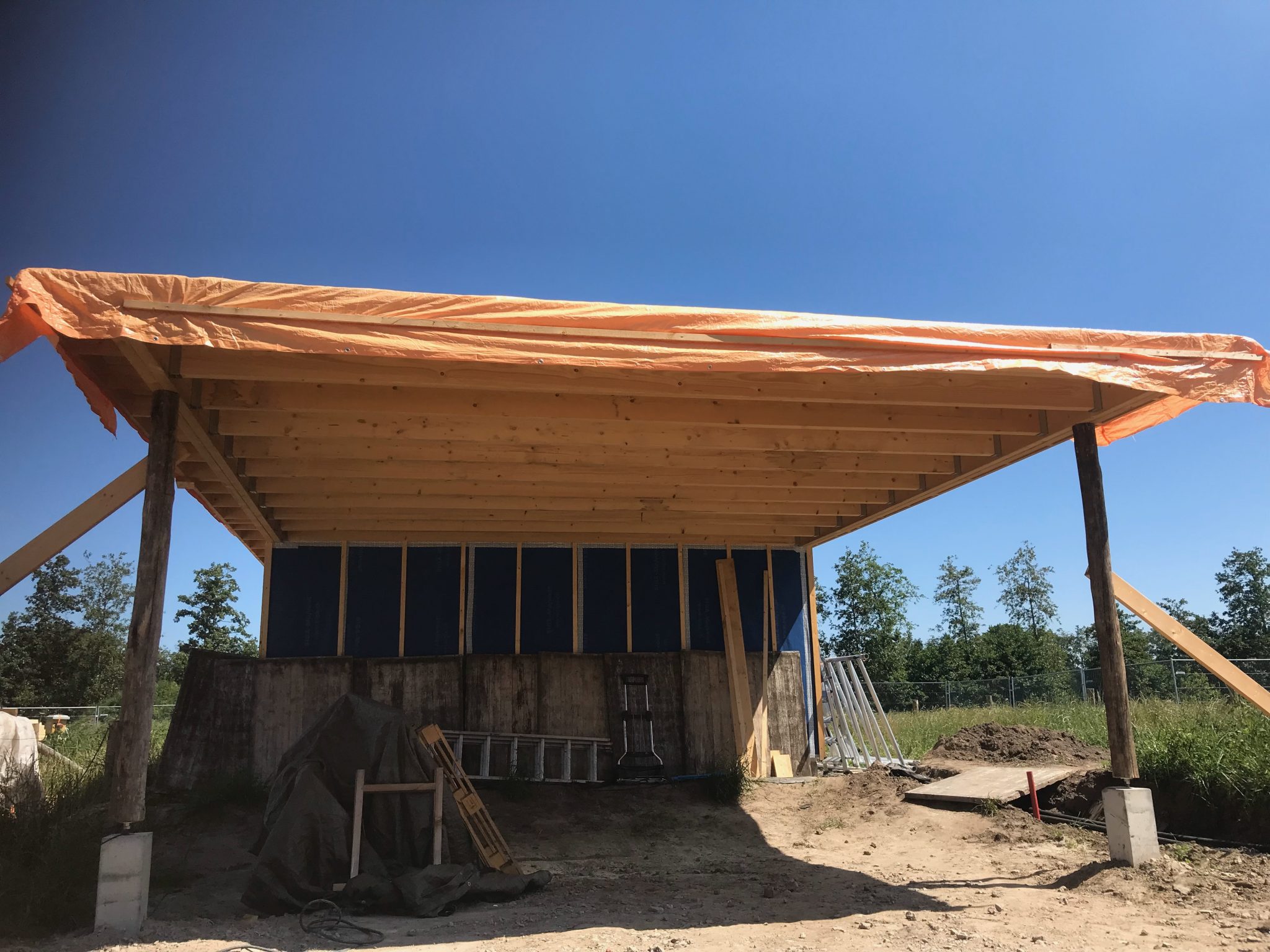 Als eerst de garage neergezet voor opslag voor het meubilair én droog werken onder de carport.