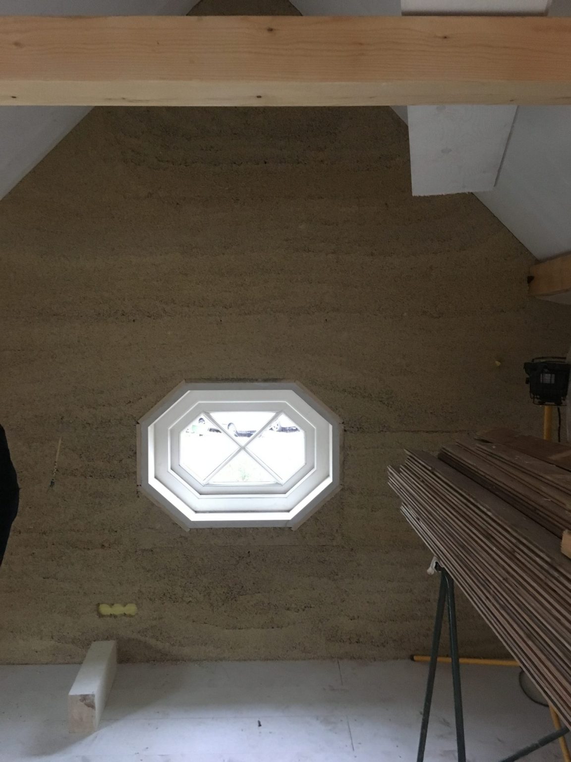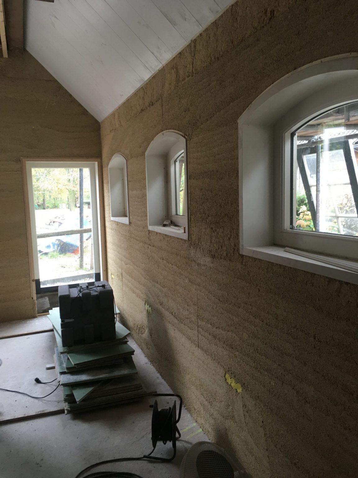 Kalkhennep volgt het gebouw. Dikte 15 centimeter damp-open, vochtregulerend, isolerend. De wanden zijn weer strak getrokken Ook als deze uit het lood staan.